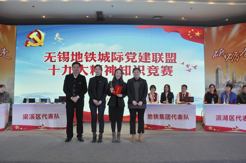 12月28日,无锡地铁城际党建联盟“不忘初心跟党走 砥砺奋进新时代”学习十九大精神知识竞赛决赛在地铁集团举行,由梁溪区卫计局钱雅妮,徐旸,蒋蓉蓉等三名同志组成的代表队代表我区参赛。经过初赛笔试、复赛、加时赛,梁溪代表队一路过关斩将,从众多代表队中脱颖而出,荣获了第一名的好成绩,展现了梁溪党建工作的深厚底蕴和党务干部的扎实功底。(梁溪区委组织部、梁溪区卫计局)